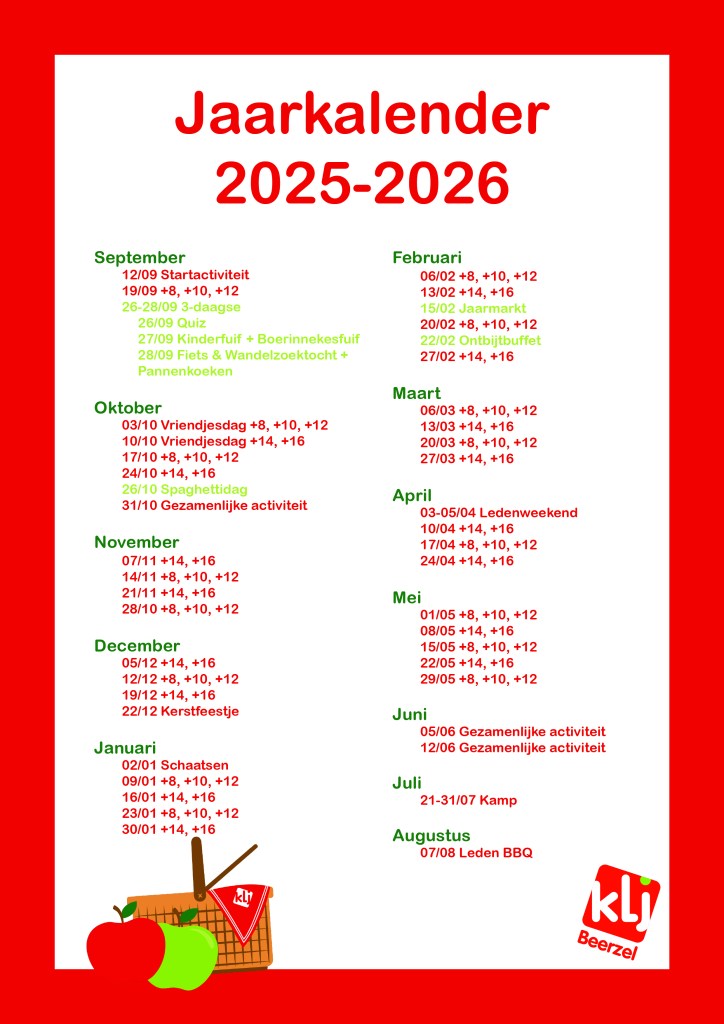 Wij zijn Katholieke Landelijke Jeugd (KLJ) Beerzel. Onze werking is onderverdeeld in vijf leeftijdsgroepen: